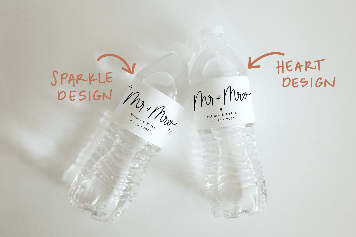 2" x 8" vinyl, water-resistant labels with "Mr + Mrs", and two lines of custom text (names and date). Water bottle is not included.