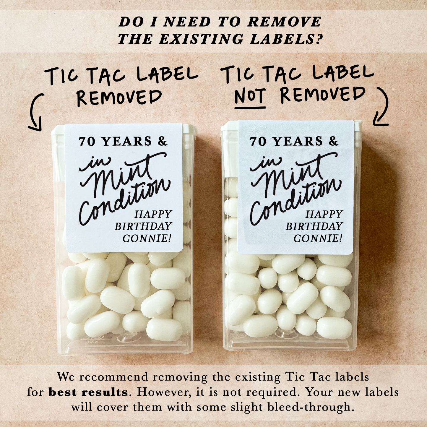 We recommend removing the existing tic tac label for best results. If they are placed directly on top of the existing tictac label, the existing label will be slightly visible through your personalized labels.
