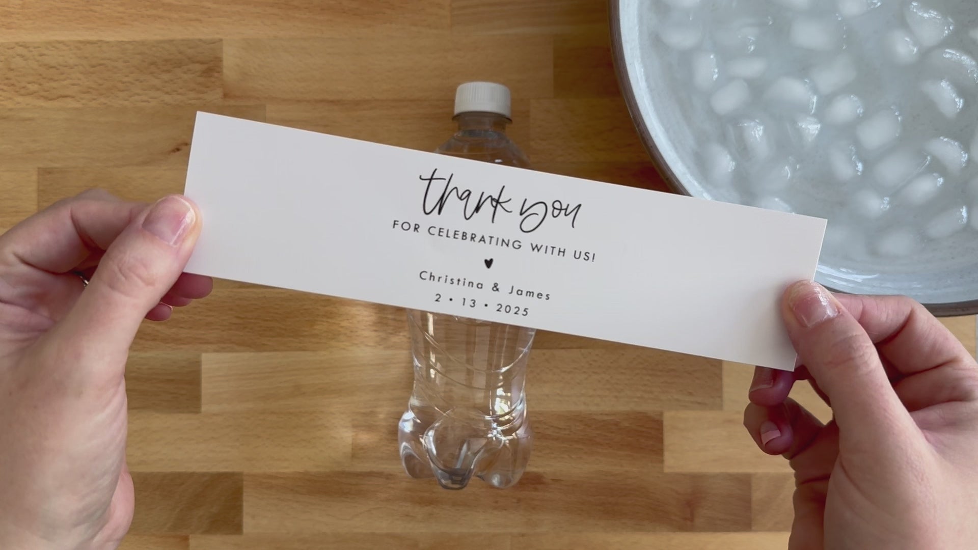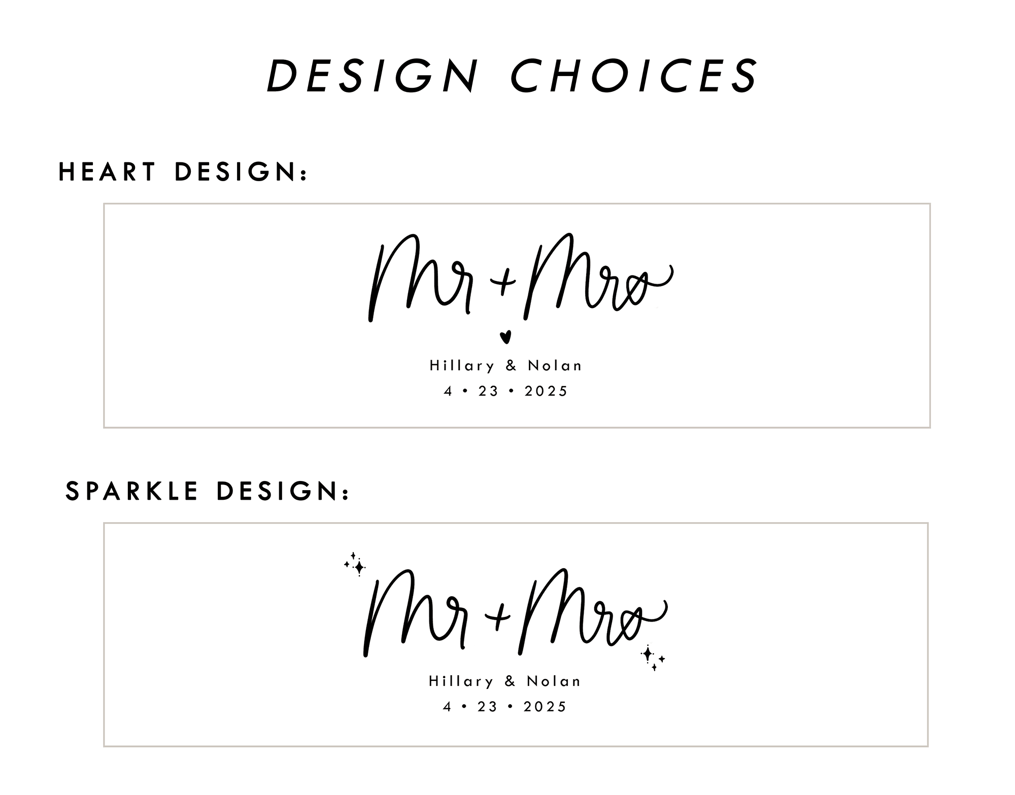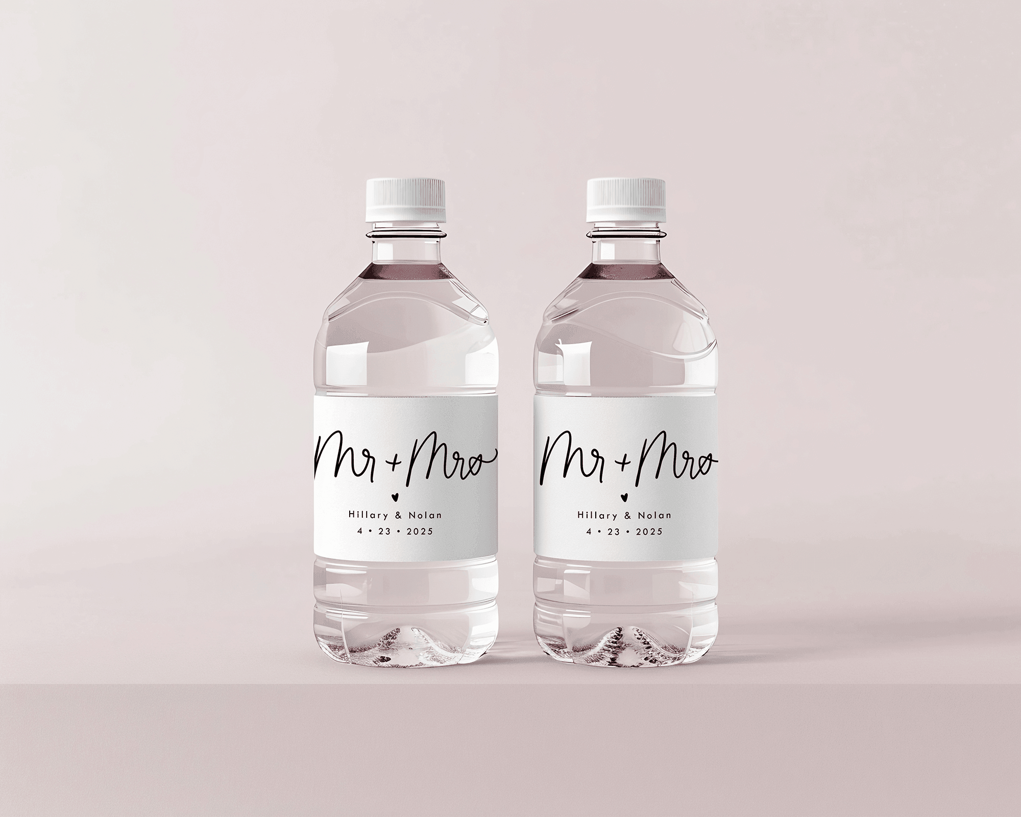 2" x 8" vinyl, water-resistant labels with "Mr + Mrs", and two lines of custom text (names and date). Water bottle is not included.
